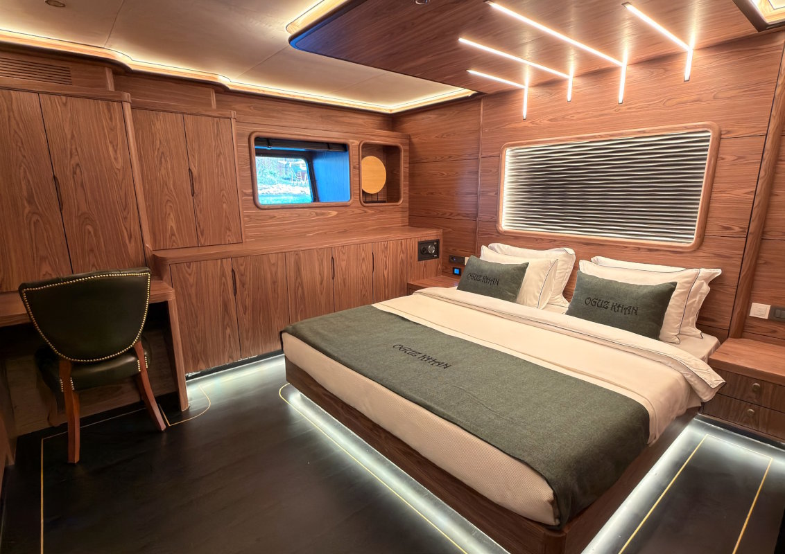 - 6 cabines (1 cabine master , 4 cabines doubles et 1 cabine avec deux lits simples convertibles en lit double), chacune avec climatisation, TV, coffre-fort et salle de bain. La cabine master dispose d'un hammam.